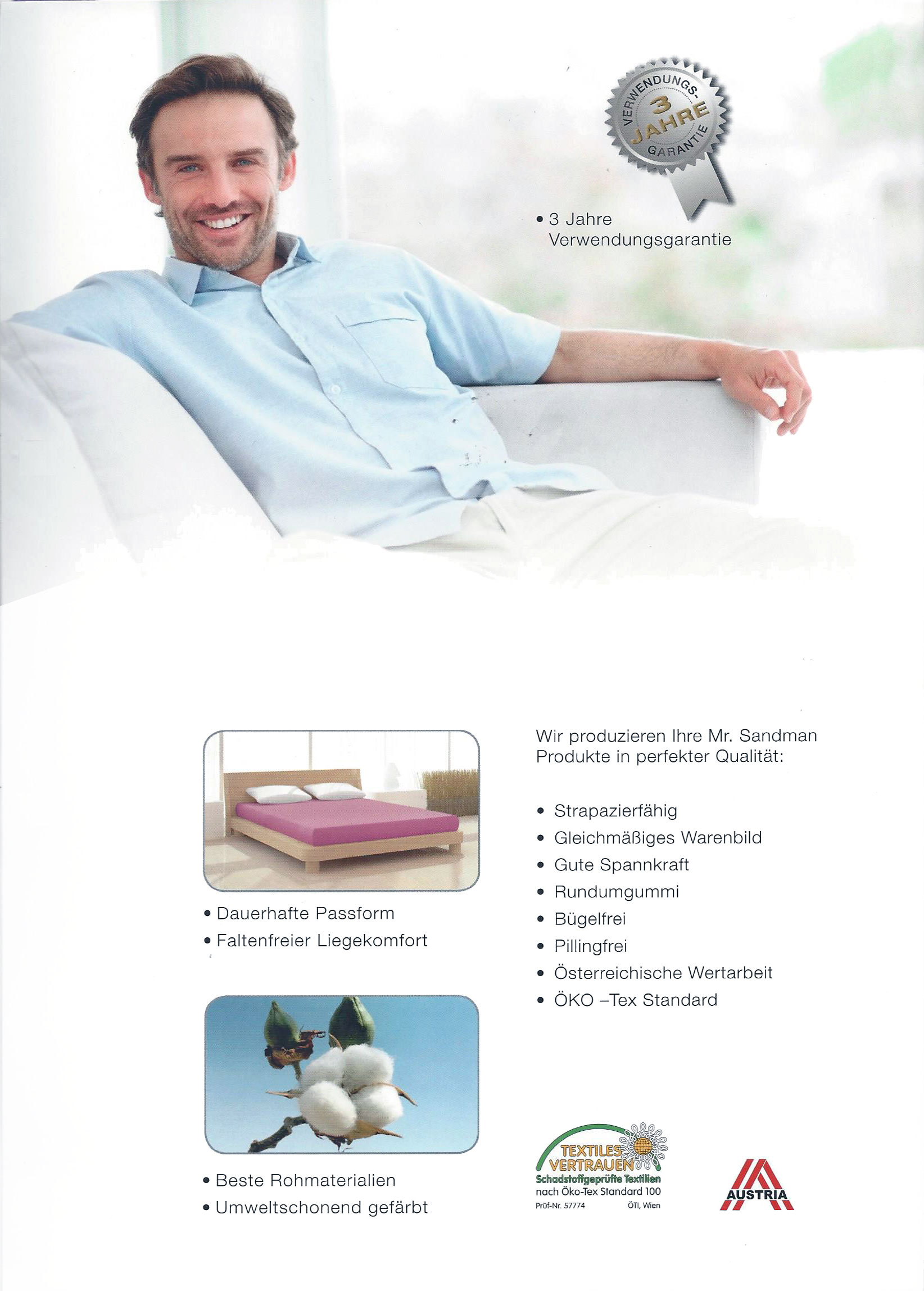 Mr. Sandman Laken werden in Österreich aus besten Rohmaterialien hergestellt und entsprechen nicht nur dank umweltschonender Färbung dem OEKO-TEX Standard 100.